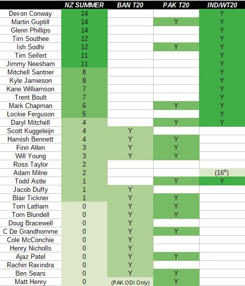 Quite a bit did change across that summer of T20s. Devon Conway and Glenn Phillips played every game, locking on their places in the 1st XI. Colin De Grandhomme was injured and lost his spot, Ross Taylor got dropped. Tim Seifert bounced around the order and missed the final series with Devon Conway flawlessly taking over the gloveman duties… his position is the biggest unknown factor in trying to select a team from that World T20 group. But you can check the site (and the article links up above) for way more context on how those squads are looking.