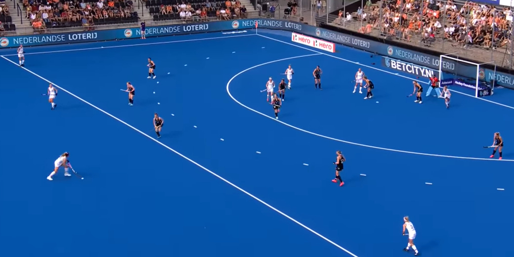 Aotearoa does well to get their defensive numbers in the frame but this is where Germany scored their only goal. Aotearoa has six players in their defensive zone, Germany has three. Most of the kiwis are chasing the play and the Germany attackers are allowed to flow into the circle, making this a two vs two scenario. The learning here is about defensive numbers and what a team does with those defensive numbers as clogging the middle of the field to make a defensive play outside the circle would have helped this scenario.