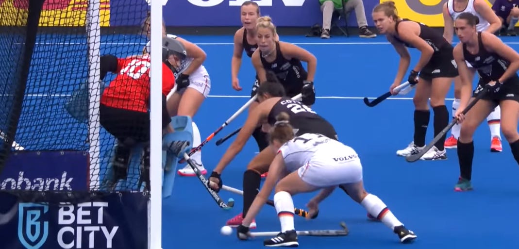 Then there is a lapse in deep defensive marking as the kiwi player loses their striker behind them. In any sport, standing in front of the opponent helps stop that player receiving the ball - but we don't have eyes in the back of our heads. Hence goalies are crucial in communicating movement - always communicate from the back forward. Germany roll out a designed play by the looks of this as they leave a channel of space in the right pocket of the circle for the striker to move into, after slipping behind the kiwi…