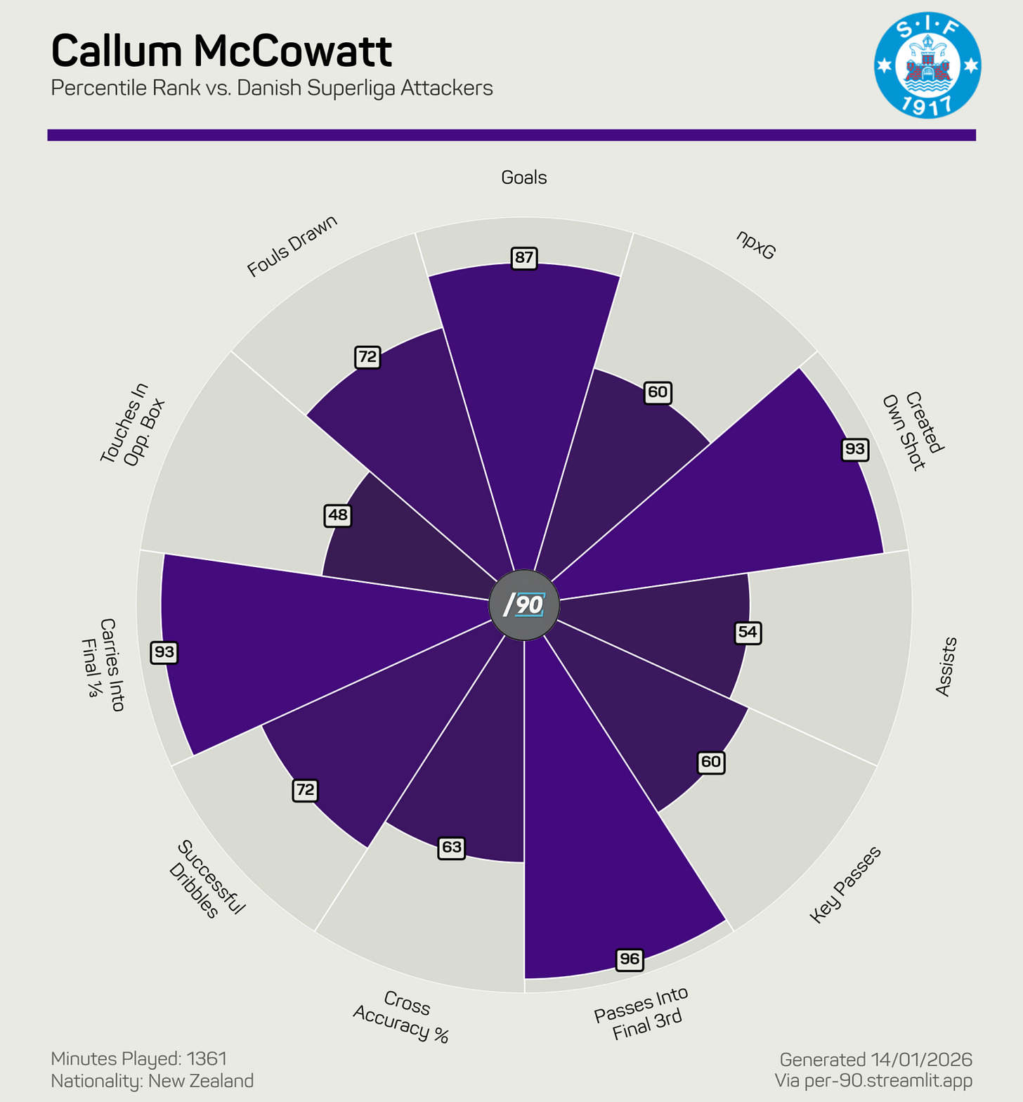 Callum McCowatt (Silkeborg, DEN) and Elijah Just (Motherwell, SCO) compared to other attacking players in their leagues...