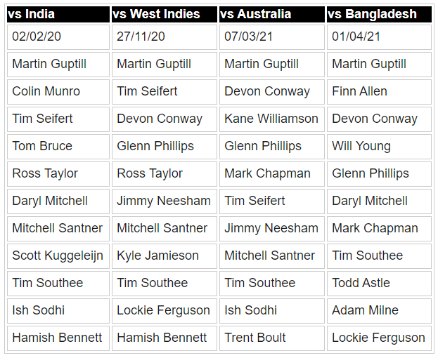 Guptill, Allen, Williamson, Conway, Phillips, Neesham, Santner, Southee, Sodhi, Ferguson, Boult