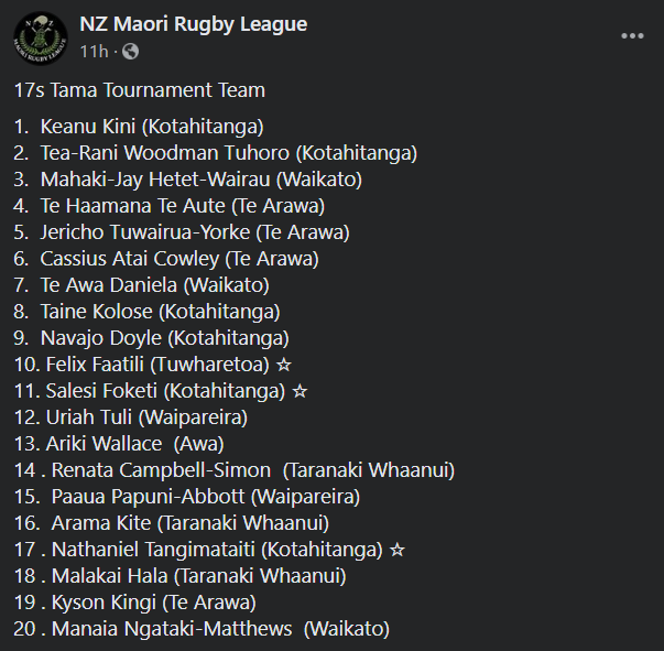 A bunch of players were named in both squads, so I’m not sure who they will opt to play for. From the Maori Under 17s team, Cassius Cowley stands out as he’s with the Warriors having been recruited from Rotorua and Felix Fa’atili from Canterbury is the younger brother of Caius Fa’atili.