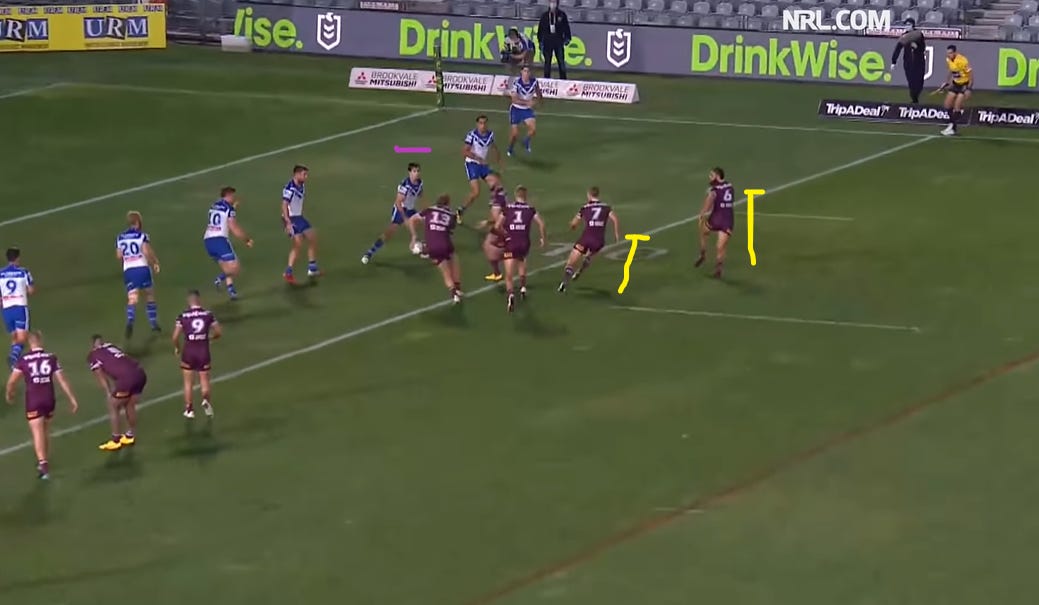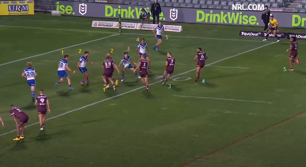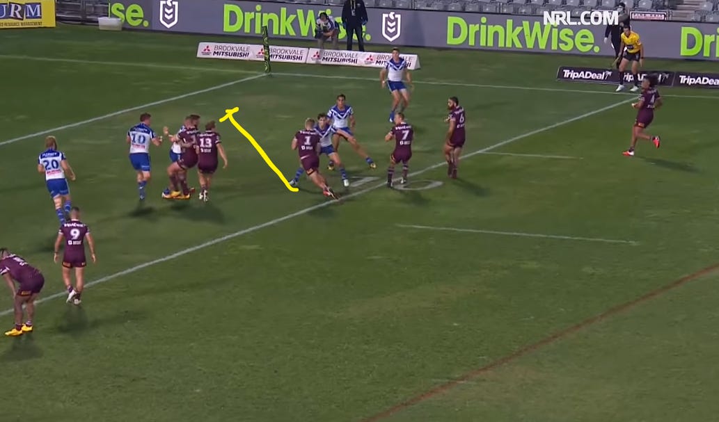 At this moment, Jake has to decide whether to hit Tom or DCE. Most likely though, Manly have already sussed out this specific play and the way this is designed leads me to believe that it is all about Tom. As you can see, it’s 2 vs 2 inside Tom and 3 vs 3 outside Tom. That’s 5 vs 5 and then Tom is the extra man - usually the extra man presents an overlap out wide but this play is about isolating Lewis and forcing him to make a move.