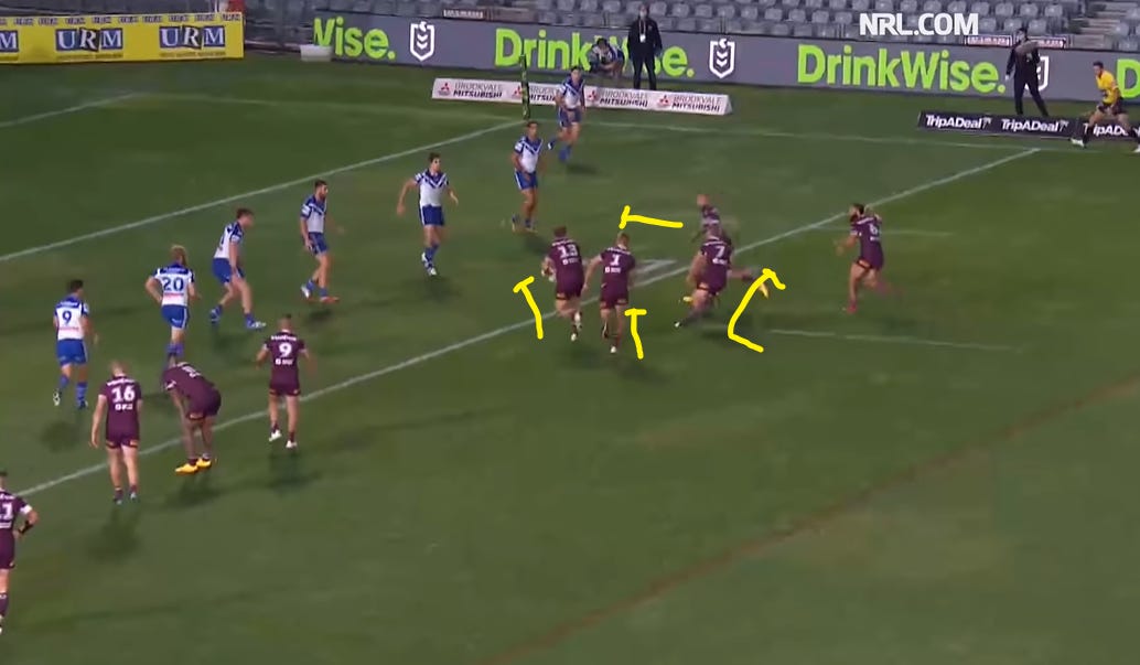 Lovely sports plays make me happy and last weekend Manly Sea Eagles offered one of the more intricate plays in the NRL against the Bulldogs. NRL teams have all sorts of backline plays involving decoy runners and sweepers sliding behind the decoys, although none quite as beautiful as this one.