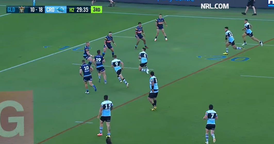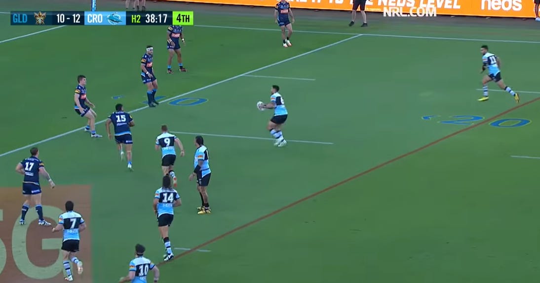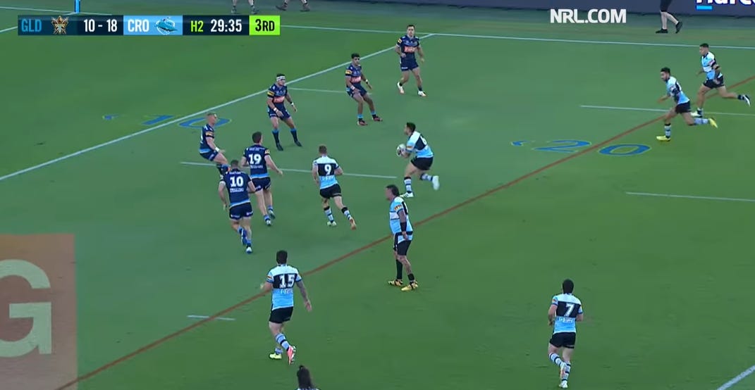That had no impact on Johnson though and he found his groove. Here Johnson gets the ball in front of the Titans defender Beau Fermor, then skips to his outside to lure in Fermor and Ash Taylor. That leaves a big hole for Briton Nikora to steam through: