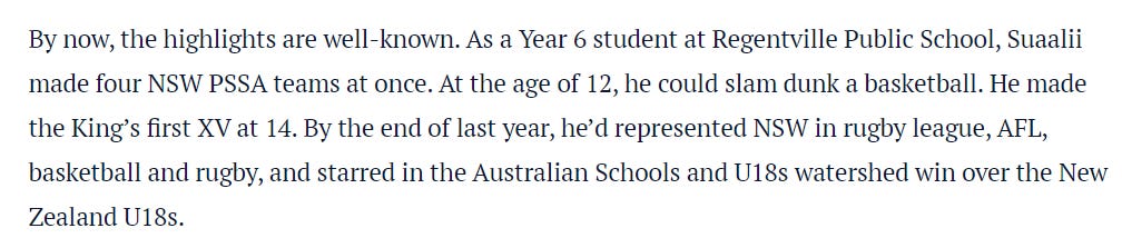 In Australia, Sydney specifically, there is an almighty battle between rugby union and rugby league for the talents of Joseph Suaalii. Of course, if you are reading the headlines about niggly between NZR and ARU, you’ll miss this but right now the Rabbitohs and ARU are competing for Suaalii - who currently plays league (Rabbitohs juniors) and union (1st 15 in Sydney).