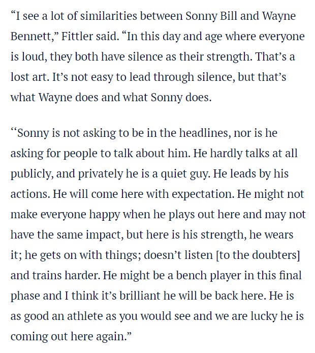 Random idea: I’ve heard anecdotes about SBW’s influence at the Roosters in his first stint there and fasting is something that pops up frequently. Fasting’s got all sorts of benefits and is generally a good idea (I’m not fuckin’ scientist, but I fast and feel lovely)…