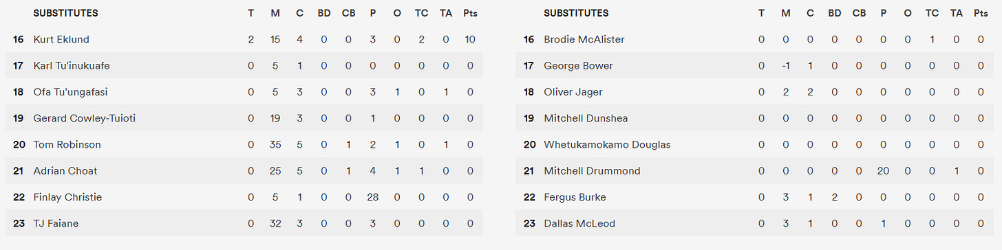 The positive impact of these second wave blokes perked my antenna as I have a wider idea of weaker international teams trying to copy the All Blacks with such 60min rotations, without the depth of talent. It felt like the Blues had the better second wave and don’t dive too deep into the stats below, just absorb it after that intuitive feeling of what the second waves did…