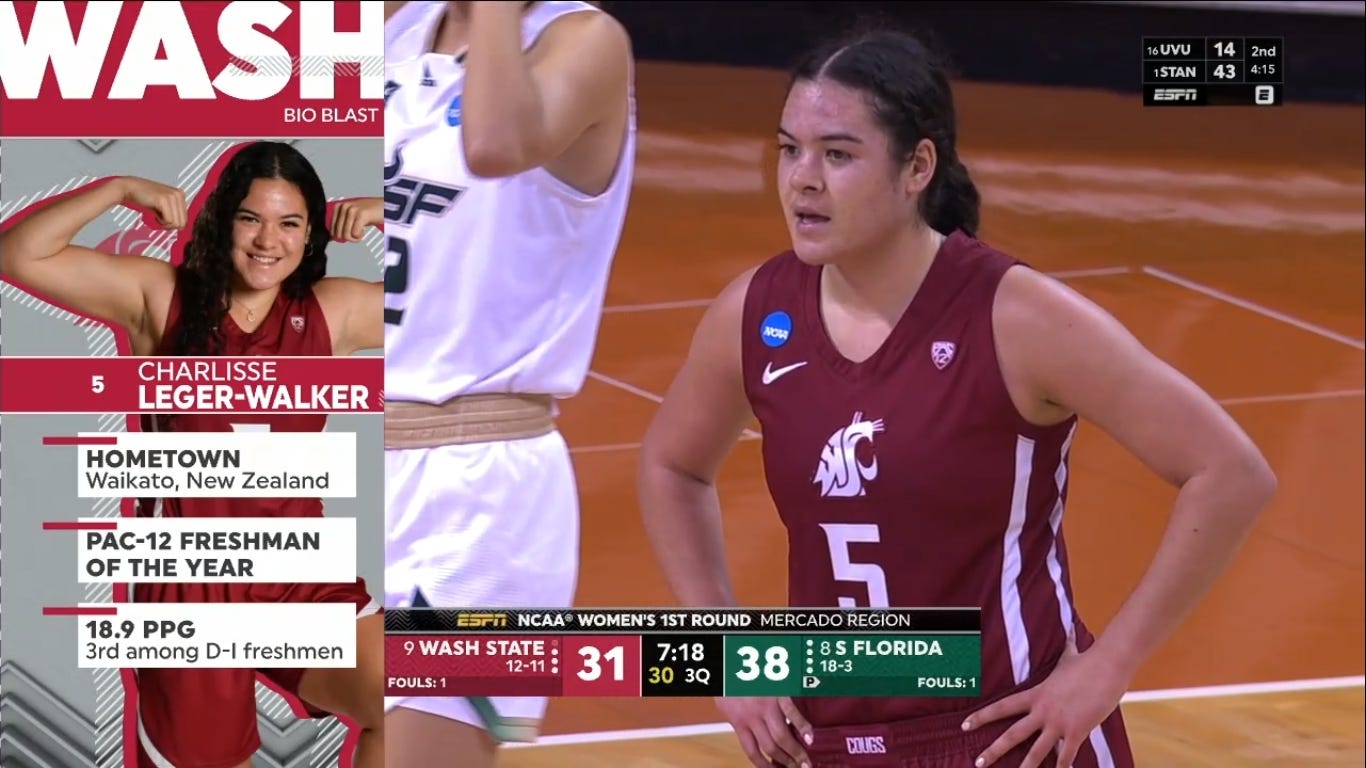 The female contingent got underway today with the Leger-Walker sisters in action for Washington State, though unfortunately they fell 57-53 as the clutch plays of their regular season didn’t quite translate. Charlisse missing a couple late looks. It was a tough shooting night for her in general - 18 points on 4/18 shooting, propped up at the free throw line - and both she and Krystal’s extreme passing skills were a bit off with seven combined turnovers. Tough trip to the tournament there, and a shame that it ends Krystal’s college eligibility. But this was only just the start for CLW, the Pac-12 Rookie of the Year. Noooot a lot of freshmen doing what she does on this stage.
