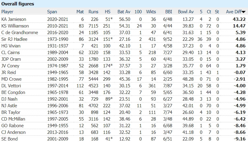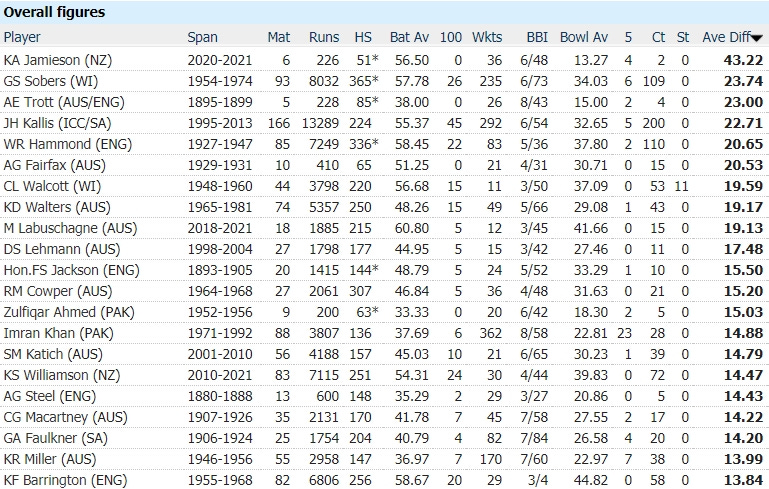 In conclusion: based on the evidence that we have at hand, Kyle Jamieson is the greatest all-round cricketer in the history of the sport. End of email.