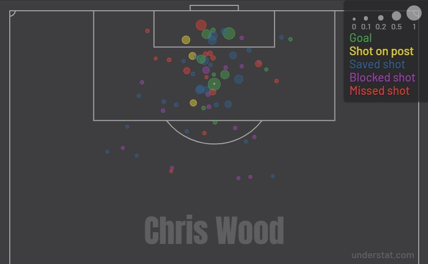 Chris Wood’s season really petered out after they secured their safety. That incredible run of form sizzled as the team turned down the heat with a 4-0 loss to Leeds, 3-0 to Liverpool, and 1-0 to Sheffield United to polish things off. Wood had one great chance to give his team an early lead against the Reds which he missed (to the horror of his ex-team Leicester City who were in the top four basically the entire season only to finish fifth as they let it slide at the end... at least they won the FA Cup though) but other than that not a lot to mention about The Woodsman. I am gonna write about him hopefully later this week though. Here’s his shot chart from the 2020-21 campaign...