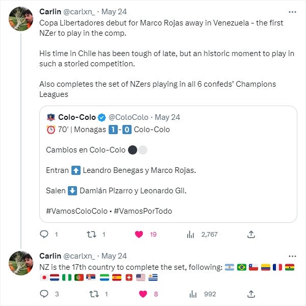Speaking of Marco Rojas, he did something special the other day when he was subbed on for Colo-Colo in a Copa Libertadores game away against Monagas (Venezuela), on for the last twenty minutes as CC rallied from a goal down to bag a 1-1 draw to keep a realistic chance of qualifying for the knockouts alive. Though more important from this perspective is that it was Rojas’ debut in the South American Champions League equivalent, the first NZer ever to play in the tournament. As pointed out by the bro on Twitter, that makes Aotearoa the seventeenth nation to have had a player in all six confederation’s top tier club comps. Can’t embed tweets in Substack any more because of E*** M*** so here ya go...
