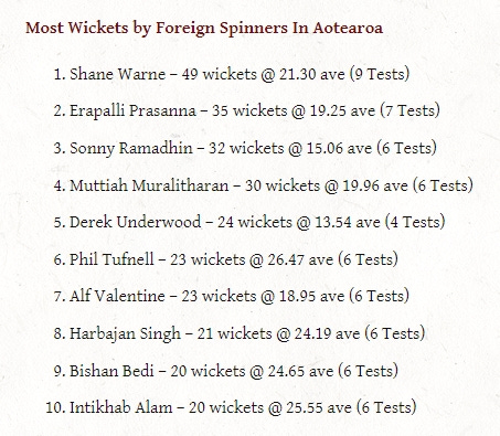 Had Muttiah Muralitharan, who took 30 wickets at 19.96 ave in NZ across six matches, played a little more in this country then he’d have been up with Warne, which is poetic given the push and pull between those two throughout their overlapping careers. But volume does count. And Warne taking 49 wickets as a foreign spinner in NZ is nuts. Here’s a list from a piece I wrote back in April 2020...