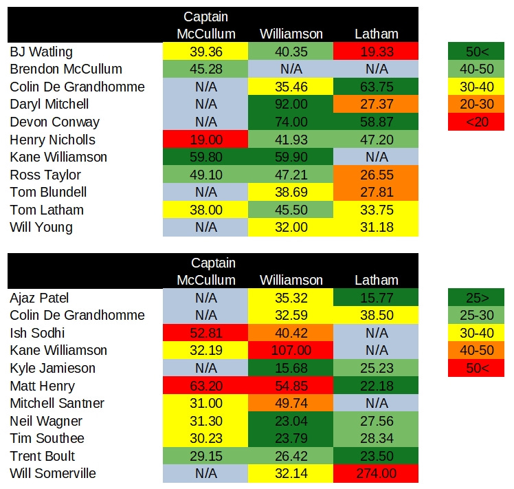 That’s actually quite a stark difference, to be honest. Twice as many wins in only seven additional games. Tom Latham, if you’re wondering, has captained eight games with four wins and four losses.
