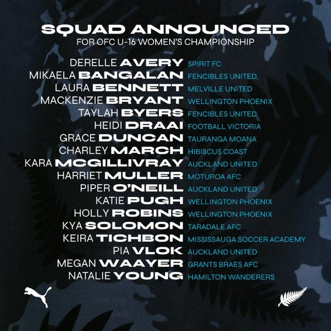 Unlike a year ago, there are a couple of overseas players included here: Keira Tichbon in Canada and Derelle Avery and Heidi Draai from Australia. Good array of clubs represented too. Only three are from the WeeNix and one of those has moved there in the past 12 months... the WeeNix are pretty smart with recruiting players after the U17 wave so don’t read much into that. Of the 15 domestically-based players, nine of them are from Northern clubs (though only five from Auckland Clubs). There are five Central League players (the three WeeNixers and a couple of Central club reps). And shout out to Grants Braes AFC from down in Dunedin. Not a club I think I’ve ever seen mentioned in these things. Coach Gunnie’s done her scouting, that’s for sure.
