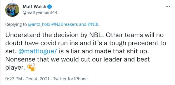 Glad to see Matt Walsh shooting down the Matt Logue suggestion that Peyton Siva is on the brink of being cut already. Walshy wasn’t at the game because of his own covid case (he reckons he’s doing better now, glad to hear it) so he did a Q+A on twitter beforehand. Which was how I noticed he’s stopped following TNC, lol. Oh well. Wonder when that happened. Anyway he reckoned Logue was a “liar” who “made that shit up” about Siva being cut.