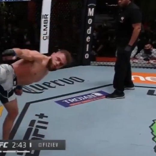 Tough loss for Brad Riddell yesterday, smoked by a twirl-kick (not official lingo). Riddell and Rafael Fiziev traded ruthless exchanges for two and a half rounds in an even contest between two homies. What I’m pondering is how Riddell evaded a kick combo from Fiziev in the first round and looked impressed by Fiziev’s flurry, then Riddell was a sitting duck as Fiziev unleashed the same kick to finish the fight.