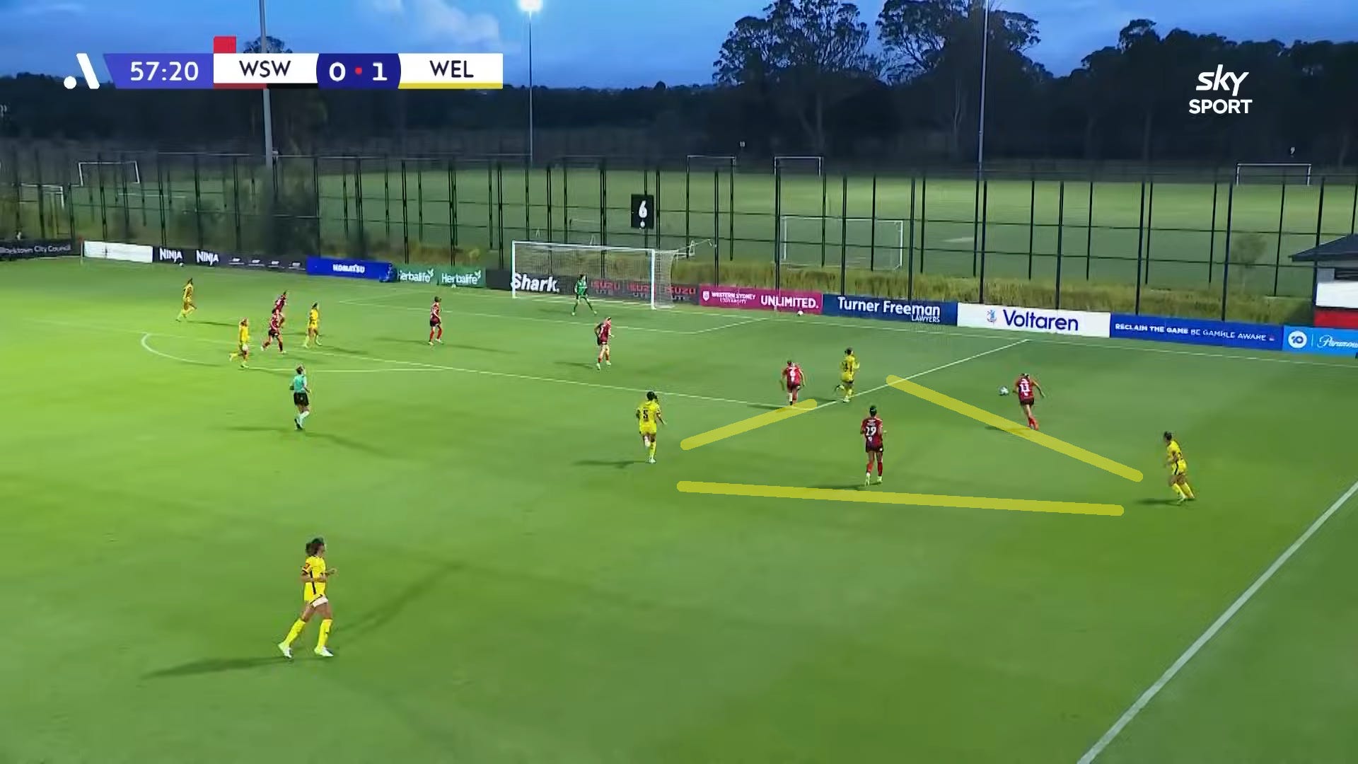We saw this plenty on the other side too with Wall, Jale, and Whinham. Because of the nature of those players, there was more overlapping variety there from Wall but that’s the beauty of it: this isn’t a set move, it’s just a starting shape full of variation. Sometimes Jale angled infield seeking a shot. Often the option was to push a pass all the way to Fergusson’s feet in the middle. Other times, Longo looked for a one-two that sent her running onto the ball at the byline. And best of all, they were patient about it. There was always that gentle infield pass so if it didn’t work the first time they could play a couple consolidating passes and then pounce if/when WSW lapsed with their marking (as happened many times in those wide areas).