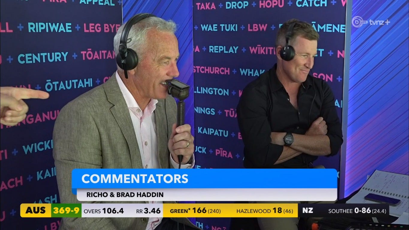 Random moment from the Blackcaps coverage that I chuckled at this morning. Brad Haddin keeps calling Mark Richardson “Richo” for some reason so they chucked that into the graphics as a joke while the camera was focused on them but the lads were too busy talking about the actual game so one of the technical staff accidentally reached into the shot while pointing to Haddin’s screen so that he’d acknowledge it (which is dutifully did)...