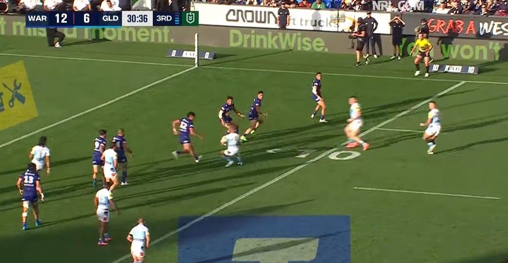 Nerdy rugby league thing here with a classic example of over-chasing on defence from Jacob Laban even though NZW have good numbers in defence - doesn’t help that Dylan Walker does the opposite and stops chasing…