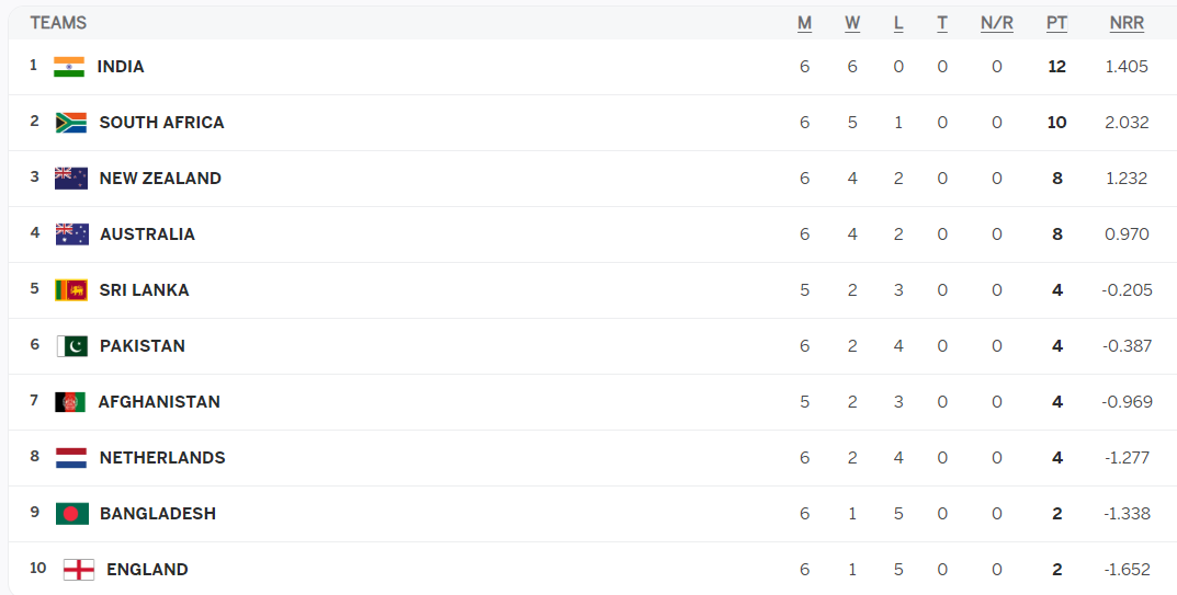 World Cup table as of Monday 30th October…