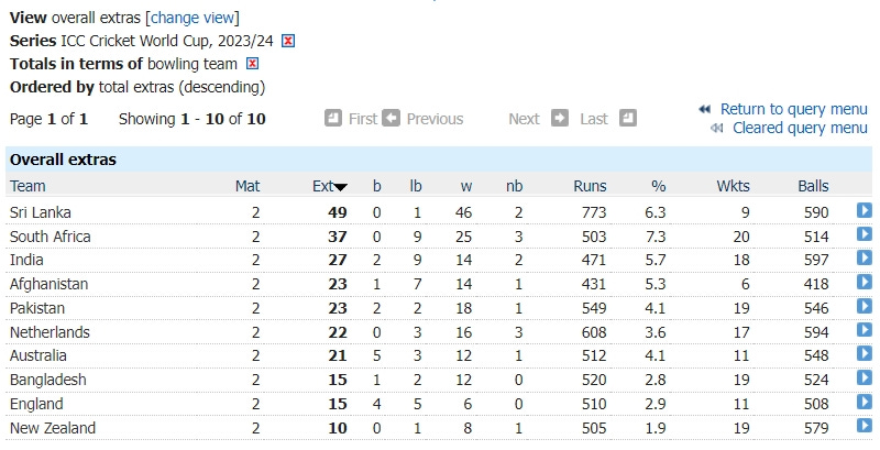 But yeah 10 extras conceded in two games. One (debatable) no ball from 579 legitimate deliveries. Bangladesh and England are the only teams not to have bowled a NB so far, they’re also the only other teams with fewer than 20 extras (both on 15). No byes allowed by the New Zealanders yet. The crown for the most total extras after two games belongs to Sri Lanka with a whopping 49... of which 46 of them were wides. Gotta give the keeper a chance, right?