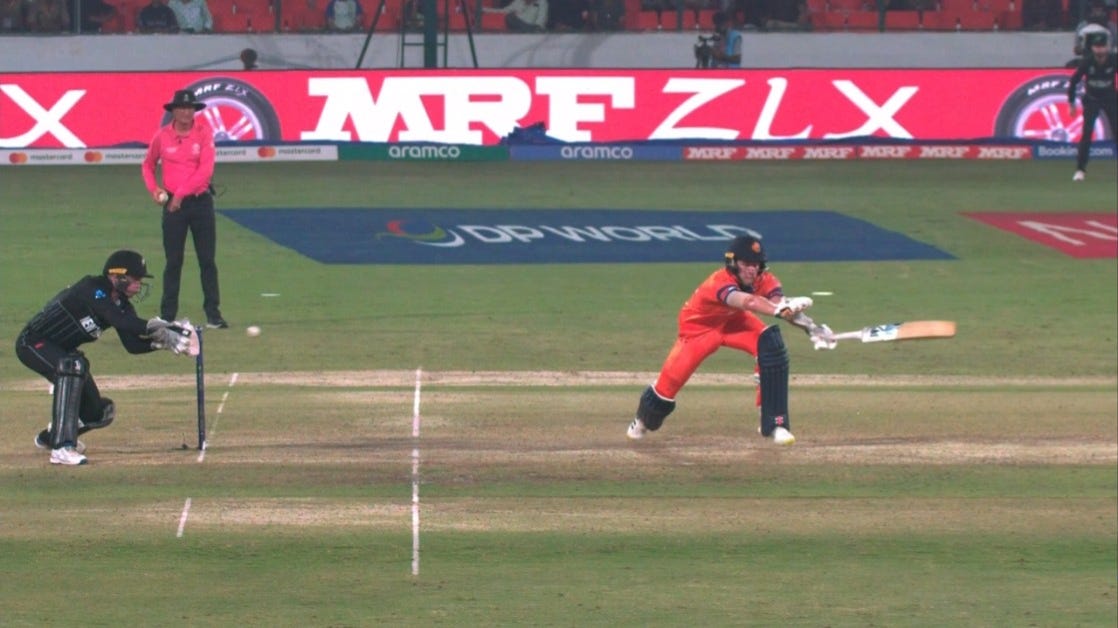 Rachin Ravindra was the naughty bloke to bowl that no ball... and it wasn’t even for overstepping. In fact it wasn’t even his fault. He bowled a deliberate wide seeing the bloke charging early at him and Tom Latham stumped Sybrand Engelbrecht as a result. Clever cricket until it was deemed that Latham’s gloves were in front of the stumps and therefore the stumping was illegal (as the delivery hadn’t been completed. The evidence was not entirely conclusive, let’s just say...