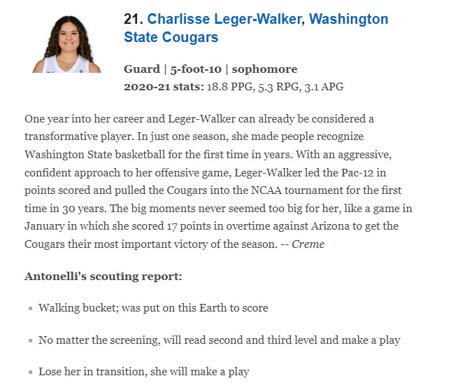 Charlisse Leger-Walker tends to pop up in this email quite often. What she’s doing is unparalleled by past kiwi college basketballers, she’s a top 25 player in the entire American country coming into only her second season at Washington State. And that’s not me saying that... it’s ESPN’s preseason rankings. They put her at 21, which was fifth best for sophomore players.